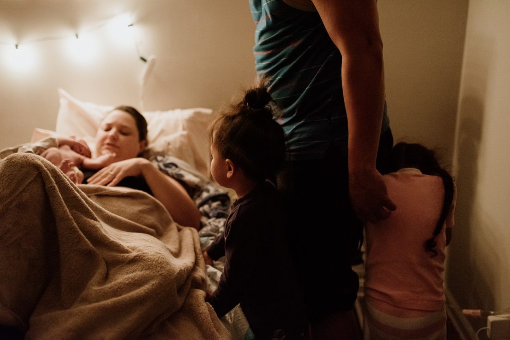 This is Sonja’s third baby. She wanted this birth to be different from her first two. She desired full control, so she opted for a mostly unassisted natural birth in her home. This would be her first time going natural & she wanted every second of it to be documented in the raw, no restrictions. I had no limitations as to what I could shoot & after viewing her gallery, she gave me permission to share all of the images, if I so wished. Amazing! I am seriously in awe of this woman. She went from sleeping comfortably in her bed with zero signs of labor, to waking up with contractions around midnight, to giving birth at 3:37 am. Crazy fast!! I arrived just in time to capture the last 17 minutes of pushing, & stayed for another couple of hours photographing all of that postpartum magic.